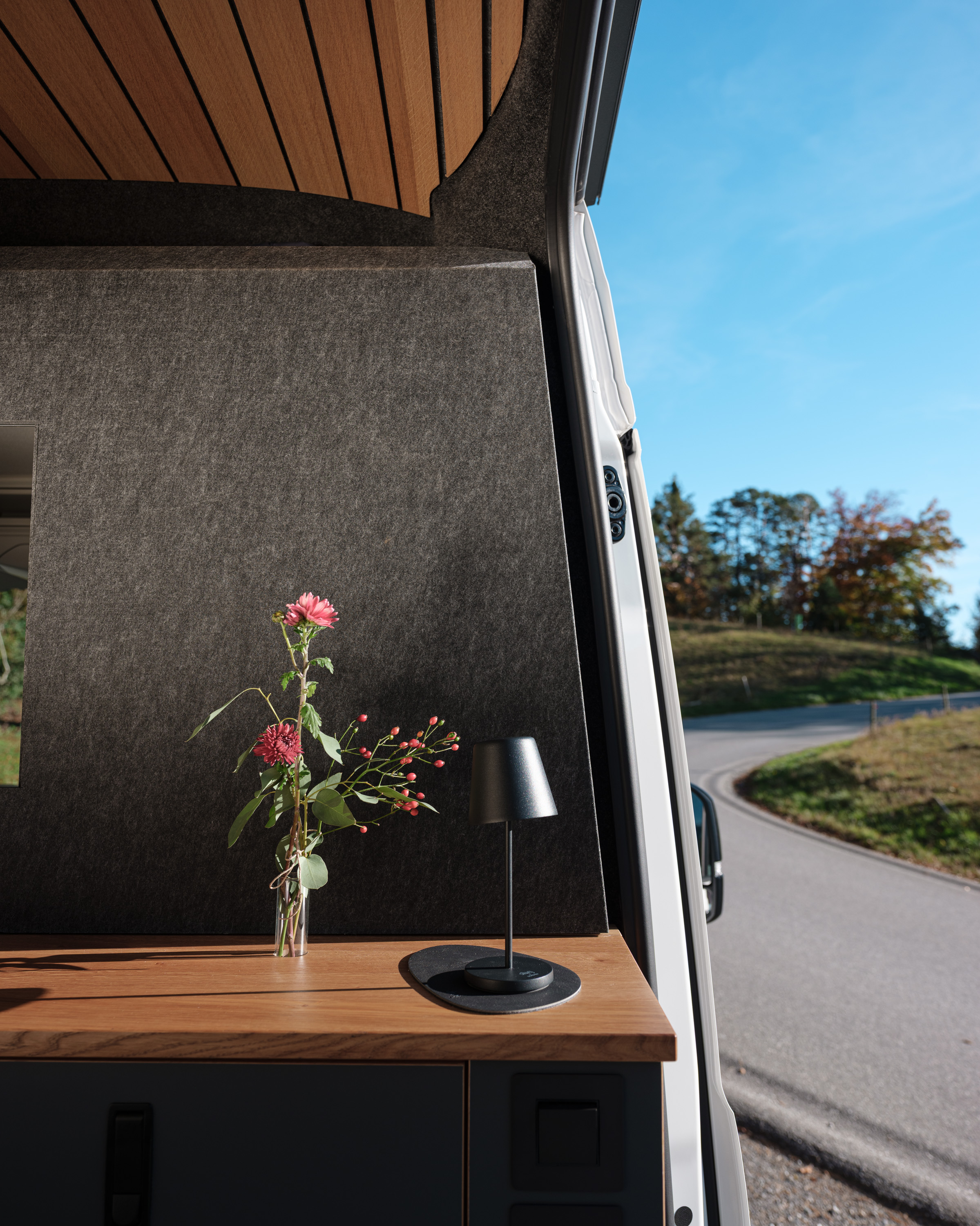 Der in sich geschlossene Wohnraum bringt wohnlichen Flair ins Fahrzeug. Der Ausbau besteht ausschliesslich aus hochwertigen und – wo möglich – aus nachhaltigen Materialien.