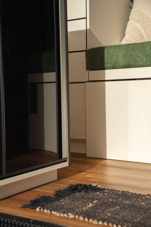 Der Wohnbereich von "Pippa" besticht durch seine Grosszügigkeit und Funktionalität. Die Küche besteht aus zwei Modulen mit integriertem Kühlschrank, dessen Fassungsvermögen 70 Liter beträgt, Schubladen und Schränken, die ausreichend Platz für Geschirr und Vorräte bieten. In die mattschwarze Arbeitsfläche sind ein Induktionskochfeld – welches über das interne Stromsystem autark funktioniert – sowie ein elegantes Spülbecken eingelassen. Eine dimmbare indirekte Beleuchtung entlang des unteren Randes der Möbel setzt das Lärchenparkett perfekt in Szene.
